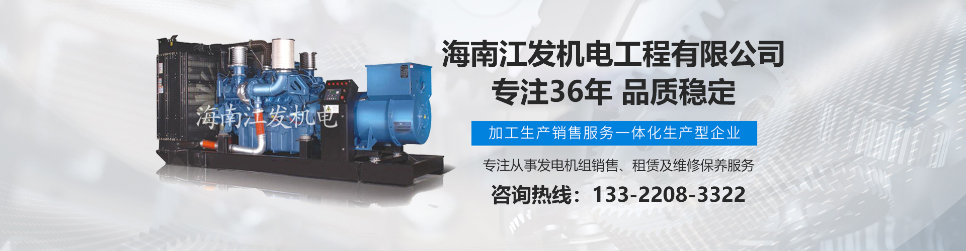 海南江發(fā)機(jī)電工程有限公司是海南經(jīng)營(yíng)進(jìn)口、國(guó)產(chǎn)柴油發(fā)電機(jī)組、是海南較早、較大的銷售、租賃服務(wù)及維修保養(yǎng)專業(yè)機(jī)電公司。從1985年開(kāi)始,公司勵(lì)精圖治、銳意進(jìn)取、不斷創(chuàng)新,不僅在海南機(jī)電行業(yè)領(lǐng)域中具有先進(jìn)技術(shù)、完美管理、誠(chéng)信服務(wù),高超的產(chǎn)品質(zhì)量和性能,而且還有合理的產(chǎn)品性能價(jià)格比,令客戶滿意以及完善的支持保障。 在客戶心目中,江發(fā)公司不僅具有最好的企業(yè)信譽(yù),還是客戶最信賴的誠(chéng)信單位,而且會(huì)帶給客戶永遠(yuǎn)的光明和豐厚回報(bào)。